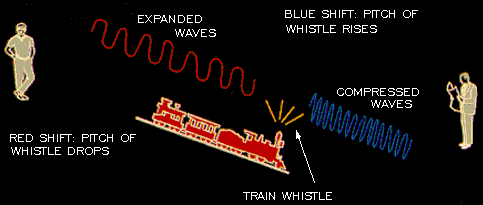 Stretching a wave makes the wavelength longer; in the case of sound, it makes the note deeper; for light, it shifts the wavelength toward the red end of the spectrum. Illustration 1 |